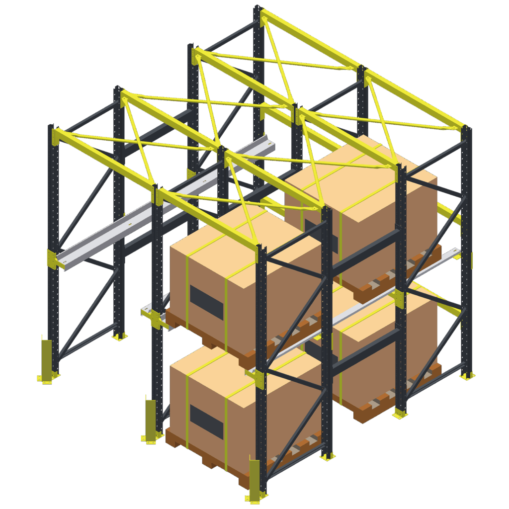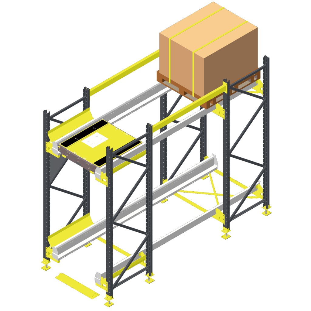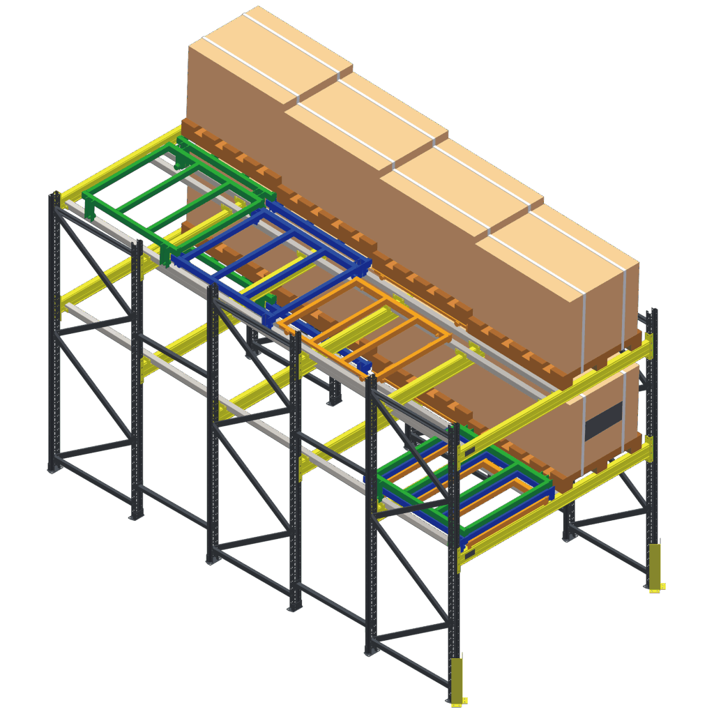 👉️此系統利用無動力台車與傾斜軌道的組合來存取貨物,屬於一種高效、多層深度的高密度儲存方案。